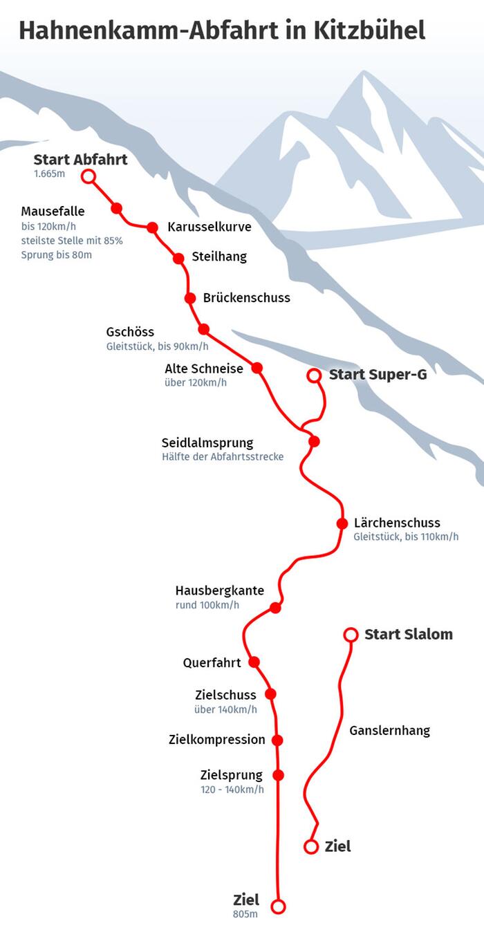 Am Freitag und Samstag steht die Hahnenkamm-Abfahrt in einer Doppelausgabe auf dem Programm. Die Super-G-Abfahrt findet wegen des coronabedingt geänderten Programms an einem anderen Ort statt. Mal finden am Wochenende die legendären Hahnenkamm- Rennen in Kitzbühel statt.